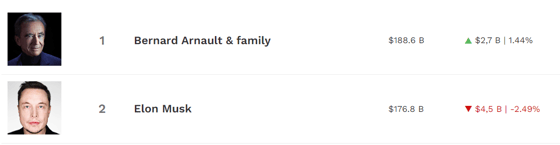 Maʼlumotlarga koʻra, Ilon Maskning boyligi 176,8 milliard dollarga, Louis Vuitton Moet Hennessy (LVMH) prezidenti Arno va uning oilasining boyligi esa 188,6 milliard dollarga baholangan.