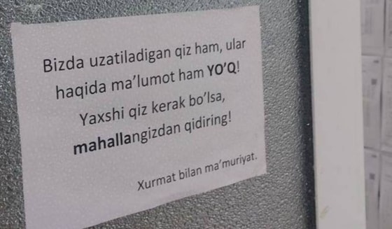 "Bizda uzatiladigan qiz ham, ular haqida ma'lumot ham yo'q! Yaxshi qiz kerak bo'lsa mahallangizdan qidiring", — deyiladi boshqa bir yozuvda.
