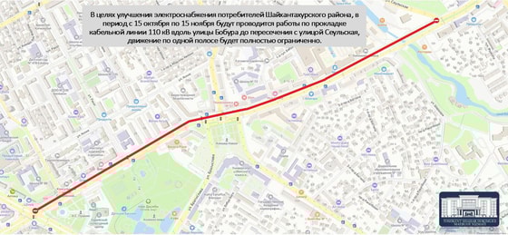 Shu sababli, 16-oktyabrdan 15-noyabrga qadar Bobur koʻchasining ushbu qismida toʻrt chiziqli yoʻlning ikki chizigʻida harakat cheklanadi.