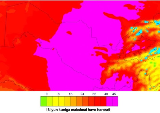 16-17-iyunda Qoraqalpog‘iston Respublikasi, Xorazm viloyatida, 17-19-iyunda O‘zbekistonning qolgan hududlarida havo harorati kunduz kunlari 40-42 darajagacha, janubda va cho‘l hududlarda baʼzi joylarda 43-44 darajagacha ko‘tariladi.
