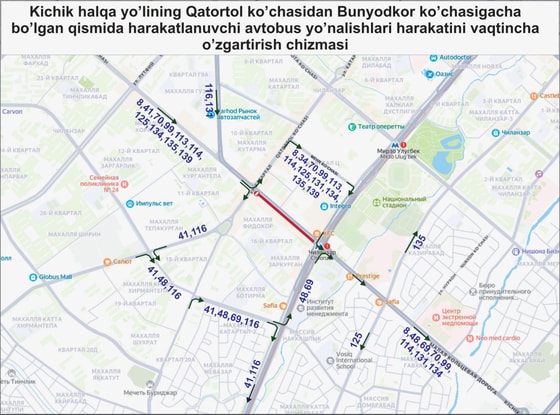 - 41, 48, 69, 116-sonli yo‘nalishlar harakati Qatortol-2, Bunyodkor ko‘chalari orqali o‘zgartiriladi.