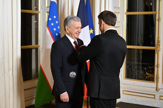 Yuksak mukofotni O‘zbekiston yetakchisiga Fransiya prezidenti Emmanuel Makron tantanali ravishda topshirdi.
