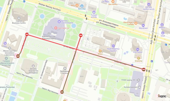 - Zarafshon ko‘chasining "Hyatt Regency Tashkent" mehmonxonasi qo‘riqlash punkti va Matbuotchilar ko‘chalari oralig‘idagi qismi;