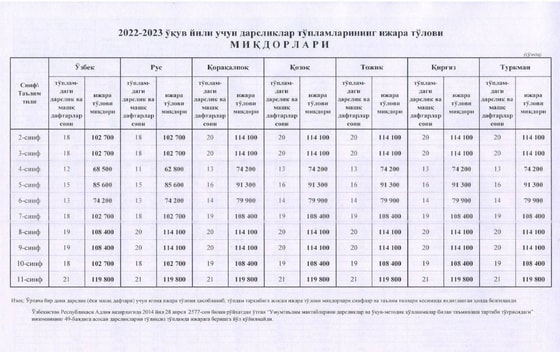Avvalroq, maktab darsliklari yillik ijara to'lovlarining narxlari e'lon qilingandi. Unga ko'ra darsliklarning ijara narxlari quyidagicha belgilangandi: