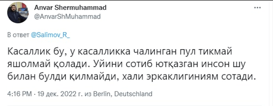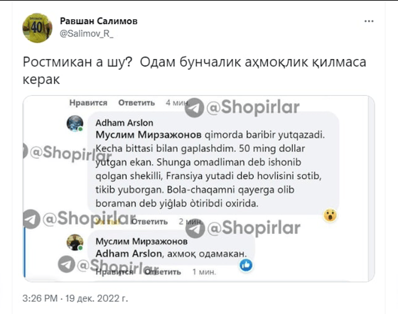 Shuningdek, yana bir foydalanuvchining yozishicha, uning bir tanishi qimorga mukkasidan ketgani va ishxonasining pulini barchasini tikib yuborib, hozirda qamalib ketganini yozmoqda.
