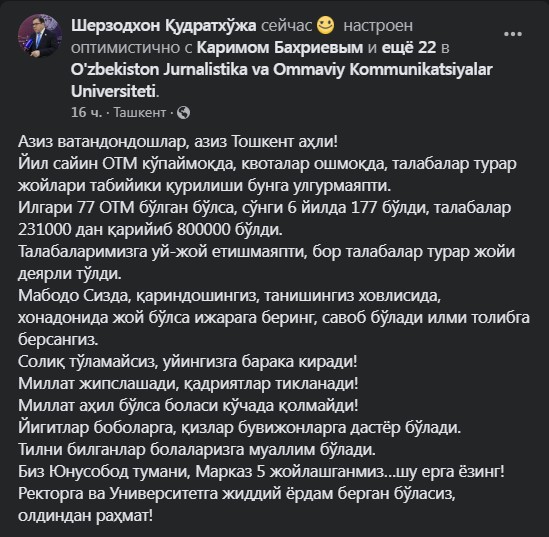 Jurnalistika va ommaviy kommunikatsiyalar universiteti rektori Sherzodxon Qudratxo‘ja talabalarni yotoq-joy bilan ta’minlash masalasida poytaxt aholisiga murojaat bilan chiqdi.