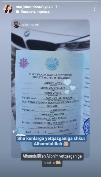 “Qodirxon”, “Jurnalist orzular fasli” seriallari orqali xalq eʼtiboriga tushgan Marjona Mirzaaliyeva oʻgʻliga Muhammadhabib deb ism qoʻyilganini maʼlum qildi.