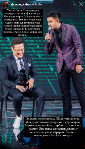 “Million” jamoasining aʼzosi Davron Kabulov oʻzining Instagram sahifasida “Ummon” guruhining marhum xonandasi Jasur Rafiqov bilan bogʻliq xotiralarini boʻlishdi.