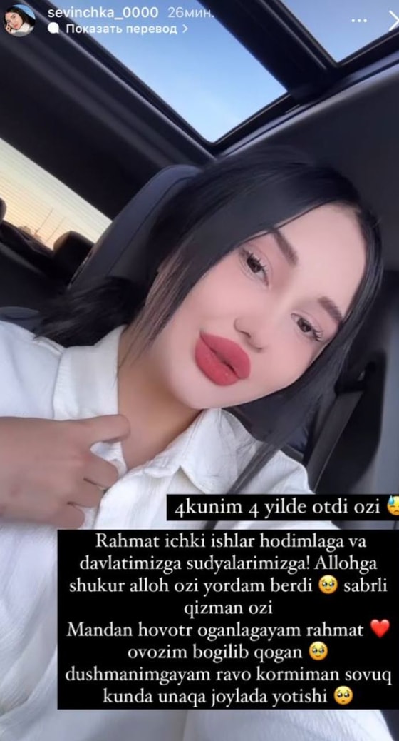 Instagramda “Sevinchka” nomi bilan ijod qiluvchi bloger Sevinch Saʼdullayevaga uning ishitokidagi videolar ijtimoiy tarmoqlarda tarqalib, keng muhokamalarga sabab boʻlgani tufayli besh sutkaga maʼmuriy qamoq jazosi belgilandi. Shundan soʻng uning ishi appellyatsiyaga berilib, u muddatidan oldin ozodlikka chiqdi.