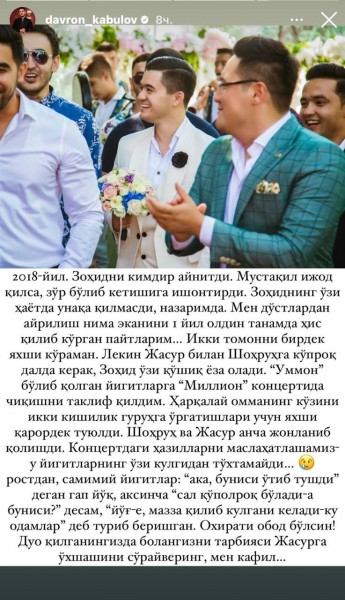 Xonanda Zohirshoh Joʻrayev otasi bilan toʻy xizmatiga borgani aks etgan videoni oʻz sahifasiga joyladi.