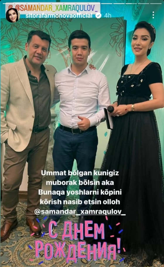 O'zbek shou-biznesidagi taniqli kinoaktrisa Sitora Farmonova aktyor, xonanda va teleboshlovchi Samandar Xamraqulovni tavallud ayyomi bilan tabrikladi.