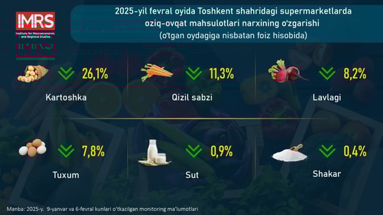 Makroiqtisodiy va hududiy tadqiqotlar instituti mutaxassislari 2025-yilning fevral oyida Toshkent shahridagi yirik supermarketlarda 21 nomdagi oziq-ovqat mahsulotlari narxining oʻzgarishini koʻrib chiqdi.