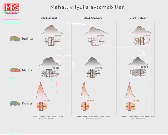 Mahalliy lyuks avtomobillar narxlari. Joriy yilning oktyabr oyida mahalliy lyuks avtomobillaridan “Equinox” narxlari sezilarli oʻzgargan boʻlsa, “Malibu” va “Tracker” narxlari deyarli oʻzgarmadi. Jumladan, mazkur davrda kam va oʻrtacha foydalanilgan “Equinox”ning oʻrtacha narxlari sentyabr oyiga nisbatan mos ravishda 1,5% va 6,3%ga arzonlagan boʻlsa, koʻp foydalanilgani 1,9%ga oshdi.