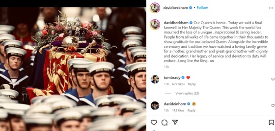 Bekxem rasmga shunday izoh yozdi: Bizning Qirolichamiz uyda.. Bugun biz qirolicha hazratlari bilan so'nggi bor xayrlashdik. Bu haftada butun dunyo noyob, ilhomlantiruvchi va g'amxo'r rahbarni yo'qotganligi uchun motam tutdi.