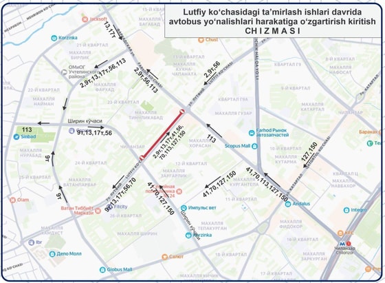 Rekonstruksiya ishlari davomida ko‘chalardagi tirbandlik ortishi ehtimoli mavjud. Shunga ko‘ra, yo‘nalishlarga qo‘shimcha o‘zgarishlar kiritilishi mumkin.