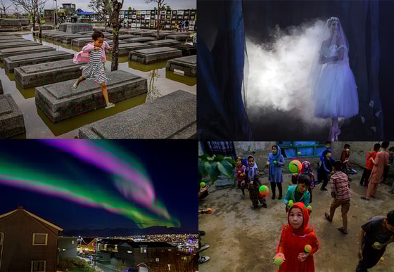 Filippindagi Nalgae tropik bo‘ronidan keyin qiz suv bosgan qabristondagi qabrlardan sakrab ketmoqda Foto: Ezra Acayan/Getty