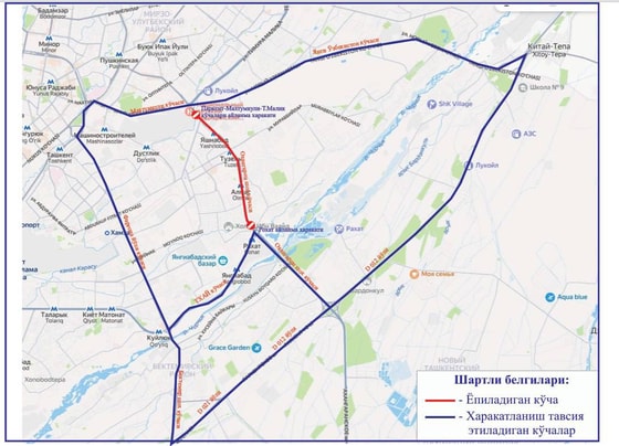 - Yopiladigan qism: Temur Malik-Parkent-Mahtumquli ko‘chalari aylanma harakatidan, TXAY-Ohangaron shoh ko‘chalari aylanma harakatigacha bo‘lgan qismi.