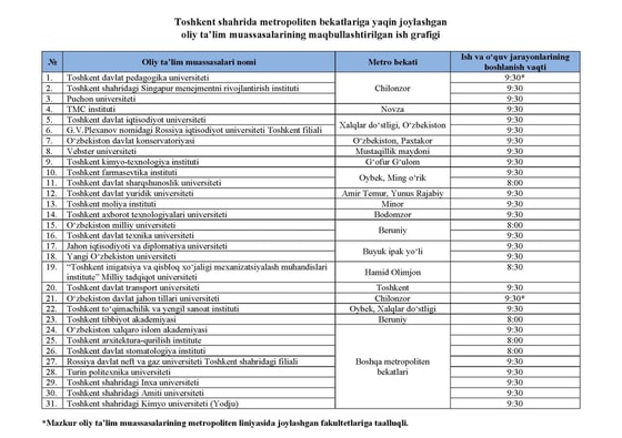 Transport vazirligi, Oliy va oʻrta maxsus taʼlim vazirligi hamda Toshkent shahar hokimligi tomonidan qabul qilingan qarorda keltirilishicha, tegishli taʼlim muassasalarida ish grafigi maqbullashtirilgandan soʻng tigʻiz vaqtlarda metropolitenda yoʻlovchi oqimini toʻgʻri taqsimlash boʻyicha qoʻshimcha choralar koʻriladi.