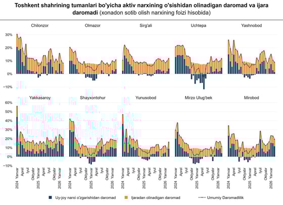 2026-yil martda Toshkentda uy-joyga investitsiyalarning daromadliligi 14,6% gacha yetdi. (2025-yil martda - 6,2%). Bunda, ijaradan keladigan o‘rtacha daromad 8,7% dan 8,0% gacha kamaygan bo‘lsa, uy-joylarning o‘rtacha narxi 6,6% ga qimmatlashdi.
