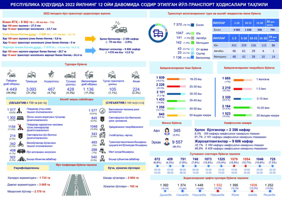 Unga koʻra, oʻtgan yili 9 902 ta YTH sodir etilgan. 2086 ta holatda oʻlim bilan YTH sodir etilgan. Sodir etilgan yoʻl-transport hodisalari natijasida 2356 nafar inson vafot etgan boʻlsa, 9606 nafari turli darajadagi tan jarohatlarini olgan.