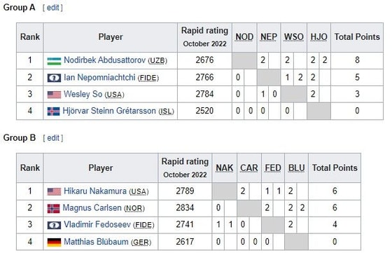 Ikkinchi guruhda Xikaru Nakamura 6 ochko bilan peshqadam boʻlib turibdi. Ikkinchi oʻrindagi Magnus Karlsenda ham shuncha ochko mavjud.