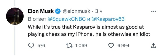 Bunga javoban Mask Twitter’da shunday yozgan: “Garri Kasparov shaxmatni mening iPhone’im kabi yaxshi o‘ynasa-da, ammo u baribir ahmoq”.