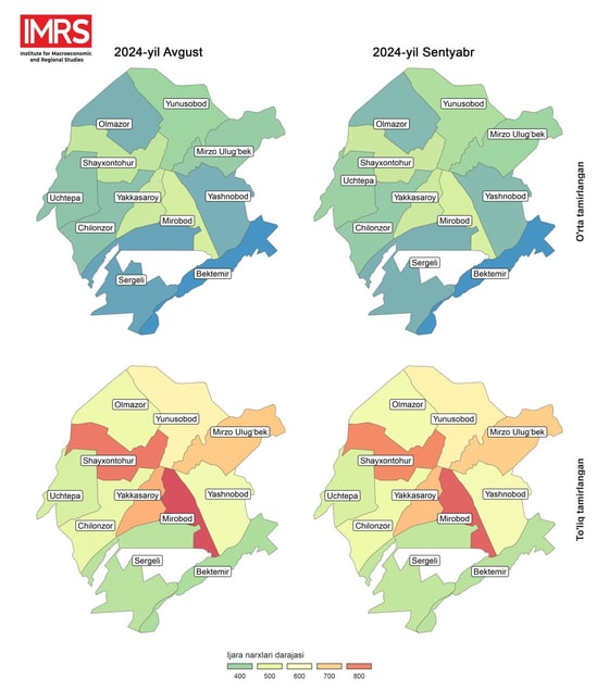 Oʻrtacha taʼmirlangan xonadonlar uchun nisbatan arzon ijara narxlari Sergeli (1 xonali - 291 AQSH dollari, 2 xonali – 363 AQSH dollari, 3 xonali – 403 AQSH dollari, 4 xonali - 463 AQSH dollari), Olmazor (1 xonali – 306 AQSH dollari, 2 xonali – 362 AQSH dollari, 3 xonali – 426 AQSH dollari, 4 xonali – 503 AQSH dollari) tumanlarida taklif etilgan boʻlsa, eng qimmat ijara narxlari Mirobod (1 xonali – 358 AQSH dollari, 2 xonali – 445 AQSH dollari, 3 xonali – 548 AQSH dollari, 4 xonali – 721 AQSH dollari) va Yakkasaroy (1 xonali – 343 AQSH dollari, 2 xonali – 460 AQSH dollari, 3 xonali – 611 AQSH dollari, 4 xonali – 631 AQSH dollari) tumanlarida kuzatildi.
