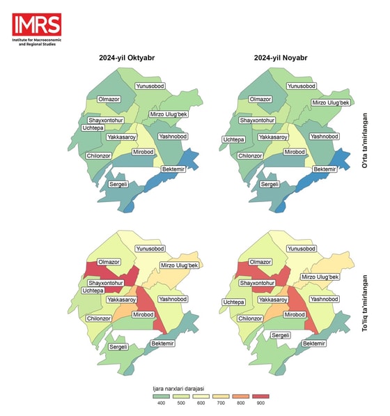 Makroiqtisodiy va hududiy tadqiqotlar instituti (MHTI) mutaxassislari tomonidan 2024-yilning noyabr oyida Toshkent shahrida uy-joylar uchun oʻrtacha ijara narxlari tahlil qilindi.