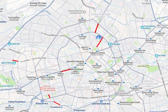 Novza masjidi - Bunyodkor-Muqumiy ko‘prigi tagidan 2-darajali yo‘l, Bunyodkor-Kamolon ko‘prigiga qadar harakat cheklanadi;