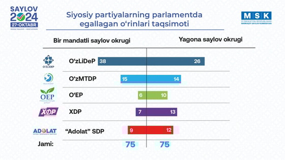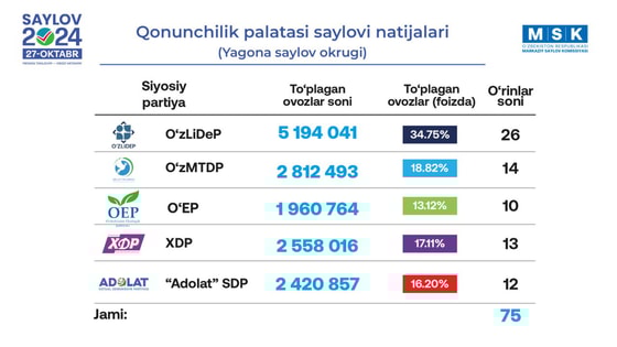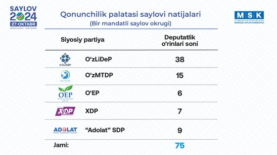 Markaziy saylov komissiyasi tomonidan Oliy Majlisi Qonunchilik palatasi va mahalliy Kengashlar deputatlari saylovining dastlabki natijalari eʼlon qilindi.