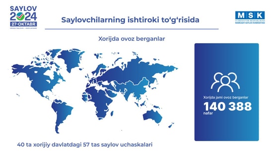 Maʼlum qilinishicha, 19 mln 544 ming 859 nafar saylovchidan 15 mln 027 ming 529 nafari ovoz berdi. Xorijdan turib esa 140 ming 388 kishi ovoz berishda ishtirok etdi.