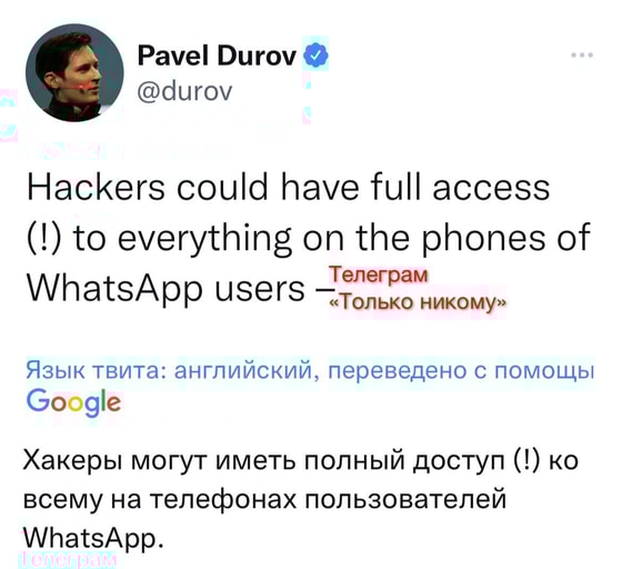 "Xakerlar WhatsApp foydalanuvchilarining telefonlaridagi hamma narsaga to‘liq kirishlari mumkin. Bu xavf oʻtgan hafta WhatsApp tomonidan oshkor qilingan xavfsizlik muammosi tufayli paydo boʻldi”, — deb yozadi Durov o'zining kanalida.