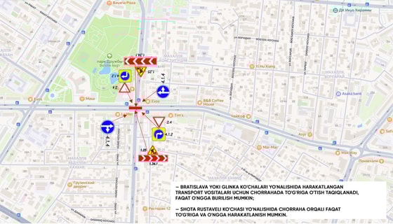 Bratislava yoki Glinka ko‘chalari yo‘nalishida harakatlangan transport vositalari uchun chorrahada to‘g‘riga va chapga o‘tish yopiladi, faqat o‘ngga burilish mumkin;
