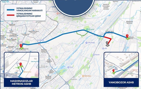 Yo‘nalish Yangi O‘zbekiston ko‘chasi bo‘ylab kelishda Yangi Toshkent bekatigacha bo‘lgan qismi qisqartirildi.