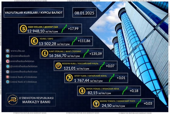 MBga ko‘ra, 8-yanvardan xorijiy valyutalarning o‘zbek so‘miga nisbatan yangi qiymati quyidagicha: