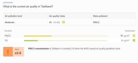 Ma'lum qilinishicha, PM-2,5 indeksi 19,3 mkg / m³ ga yetgan. Toshkentdagi PM2.5 kontsentratsiyasi hozirda JSST havo sifati boʻyicha yillik yoʻriqnoma qiymatidan 3,8 baravar yuqori hisoblanadi.
