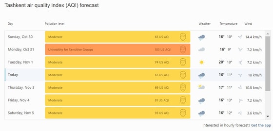 Shuningdek, haftaning qolgan kunlarida yomg'irli ob-havo bo'lishiga qaramasdan havoning ifloslanish darajasi oshib borishi taxmin qilingan.