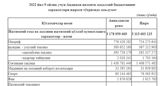 30-noyabr kuni Adliya vazirligining mahalliy davlat hokimiyati organlarining qabul qilgan qarorlari joylashtiriladigan elektron tizimida Andijon viloyati mahalliy budjetining 2022-yil 9 oylik ijrosi toʻgʻrisidagi hisoboti eʼlon qilindi.
