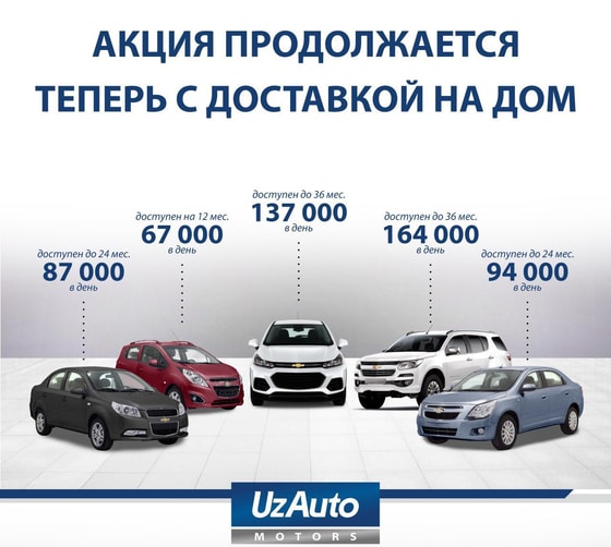 Акция с приобретением автомобиля в рассрочку продолжается. До 15 июля автомобили UzAuto Motors можно приобрести, оплатив первоначальный взнос от 40% с распределением выплаты оставшейся суммы на срок до 36 месяцев. А с учетом последних решений Специальной комиссии для всех желающих доступна бесплатная доставка выбранного автомобиля прямо на дом.