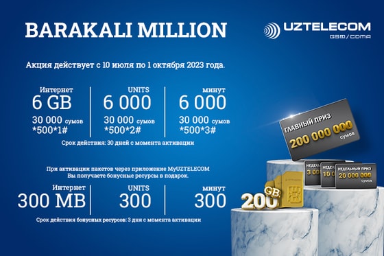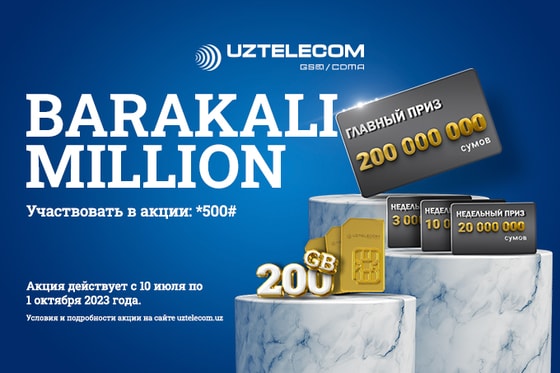 UZTELECOM начинает 3 месяца акций. Испытайте свою удачу и получите возможность выиграть главный приз – 200 млн сумов ежемесячно и 20, 10, 3 млн сумов каждую неделю. А также каждую неделю UZTELECOM будет разыгрывать красивые номера II, III и IV категорий с кодом оператора 77 и интернет-пакеты номиналом 200 GB. Розыгрыш пройдет с 10 июля по 1 октября 2023 года.