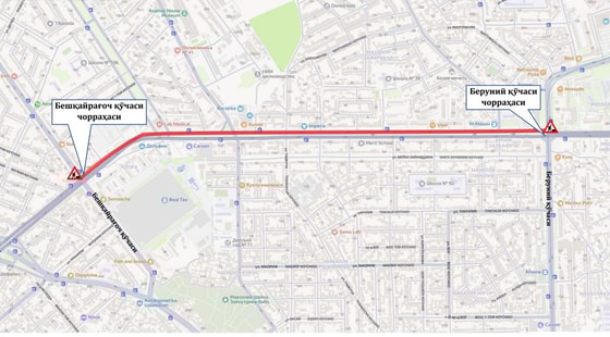 В связи с этим с 15:00 18 июля до 06:00 21 июля будет полностью перекрыто одностороннее движение автотранспорта на участке Малой кольцевой автомобильной дороги от пересечения с улицей Бешкайрагач до пересечения с улицей Беруни.