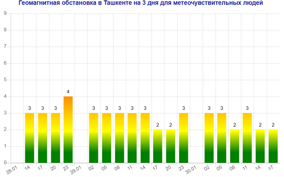 Сегодня (28 января) на столицу Узбекистана обрушатся четырехбалльные геоудары, они прогнозируются в 23:00.