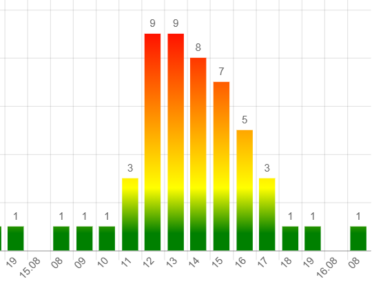 Девятибалльный показатель будет наблюдаться в 12:00-13:00. Снижение ожидается ближе к 14:00.