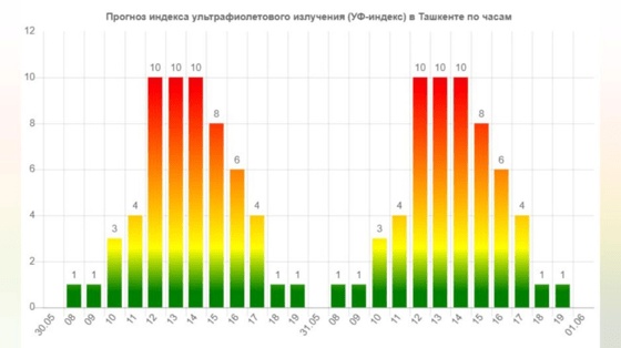 Во вторник и среду (30-31 мая) в Ташкенте будет наблюдаться экстремальный уровень ультрафиолетового излучения, следует из данных Meteonova.