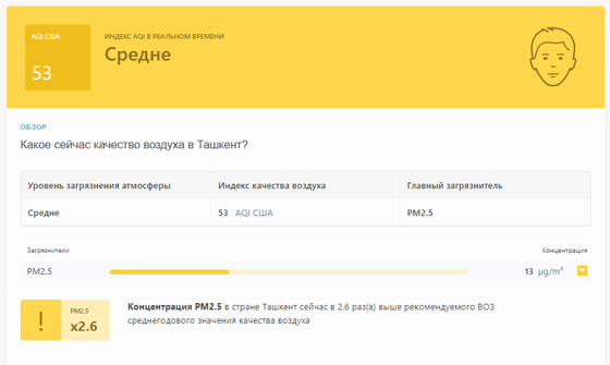 В 08:45 станция мониторинга в столице Узбекистана показывала результат в 53 AQI. Концентрация PM2.5 — в 2,6 раза выше рекомендуемого ВОЗ среднегодового значения качества воздуха.