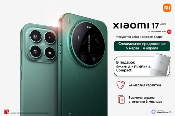 С 5 марта по 4 апреля 2026 года при покупке Xiaomi 17 или Xiaomi 17 Ultra покупатели получают в подарок очиститель воздуха Xiaomi Air Purifier 4 Compact.
