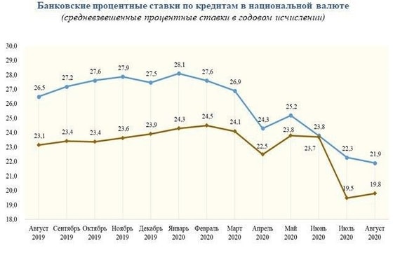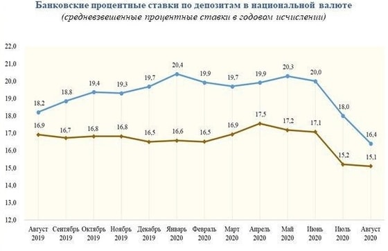 Отмечается, что по данным за август ставка по депозитам среди населения установлена на уровне 16,4%, при этом в июле она составляла 18%. К сравнению в августе прошлого года депозитная ставка составляла 18,2%. Ставка по депозитам для предпринимателей упала до 15,1%.
