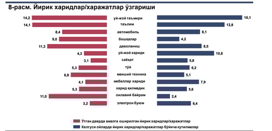 Большая часть узбекистанцев тратила деньги на ремонт жилья (14,2%), образование (14,1%), лечение (11,3%) и семейные праздники (11%).