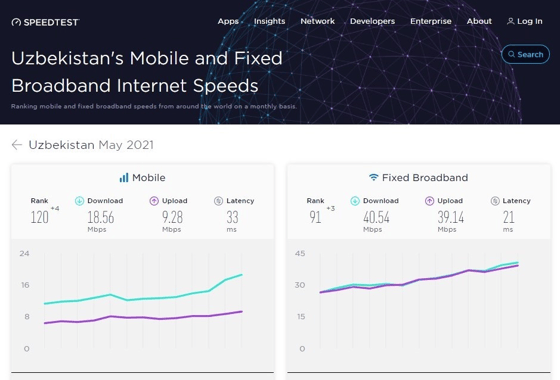 Ирландская компания Ookla опубликовала данные сервиса Speedtest.net по ежемесячному рейтингу Speedtest Global Index, в котором содержится информация по скорости мобильного и проводного интернета в мире по итогам мая текущего года. Согласно данным сервиса, Узбекистан улучшил свои позиции, о чем сообщает пресс-служба Министерства по развитию информационных технологий и коммуникаций.