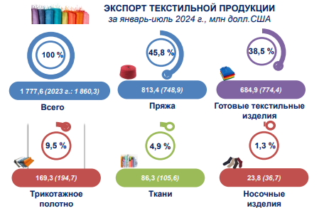 В структуре экспорта текстильной продукции основную долю занимают пряжа (45,8%) и готовые текстильные изделия (38,5%).